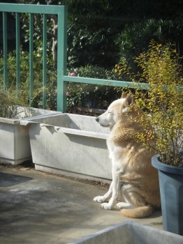 一昨日、お日様がポカポカと暖かかったんで、岩場に登ってみた。お水の中に戻ろうとしたら・・柵がちょっぴり開いているのが見えちゃった。