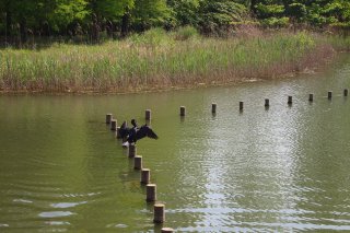 ガザガザの結果美味しいものが出てこない鵜は知らん顔で池に潜って魚とりしていた。水から出て池の杭に止まった鵜を見ていたら羽を広げている。