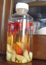 何年も前いただいたその名も効きそうな「鬼ころし」に、唐辛子とニンニクを漬け込んだ。