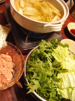 生姜とネギをたっぷり混ぜ込んだ豚挽き肉をスプーンですくって鍋に入れる肉団子鍋です。