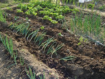 ジャガイモの芽が育ち、ネギや玉ねぎ さやえんどうがもう食べられそうだ。