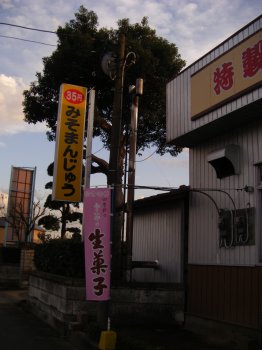夕日に映える「35円 みそまんじゅう」の看板が郷愁をさそう。。。かな?