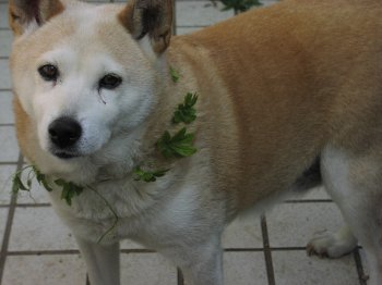 キッチンの窓の日よけに植えておいたゴーヤのツルを夫が片付けていた。その周りをハナがうろうろしていた。