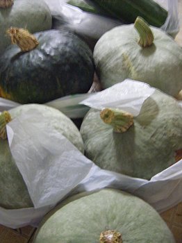 夫が家庭菜園で作ったカボチャが床に転がっている。