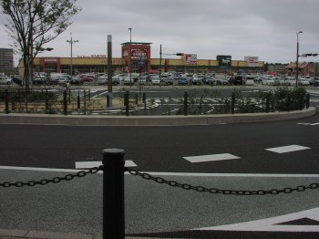 先の建物がカスミストア 赤い看板のしたあたりに「モルバン」って